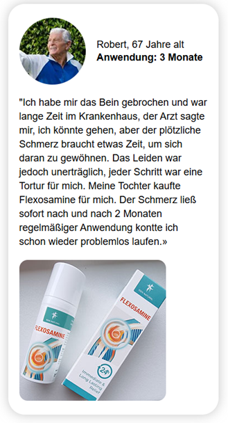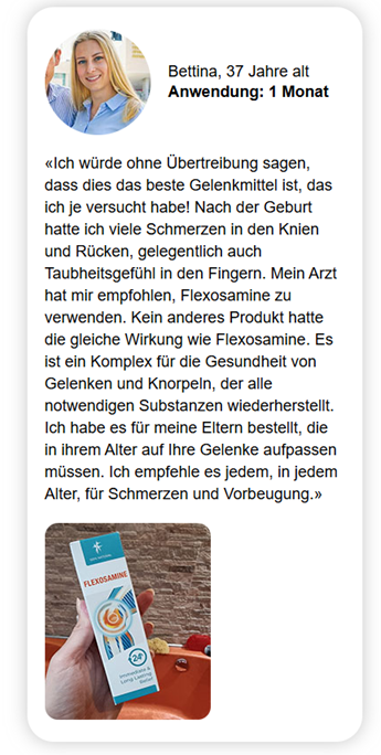 Flexosamine heilt die Symptome nicht, sondern regeneriert das zerstörte Knorpelgewebe und hilft nicht nur Schmerzen loszuwerden, sondern auch die Erkrankung, bei regelmäßiger Anwendung, vollständig zu beseitigen.